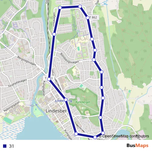 The first stop of the 31 bus route is Lindesberg station and the last stop is Lindesberg station. 31 is operational during på vardagar.
