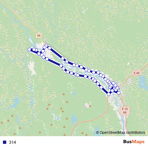 The first stop of the 314 bus route is Malung Blomsterbäcksskolan and the last stop is Malung centrum. 314 is operational during på vardagar.