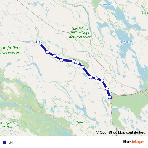 The first stop of the 341 bus route is Sorsele busstation and the last stop is Ammarnäs. 341 is operational during varje dag.
