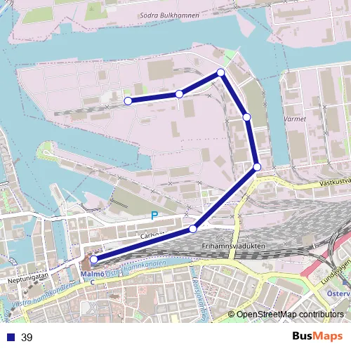 The first stop of the 39 bus route is Malmö Mellersta hamnen and the last stop is Malmö Centralstation. 39 is operational during på vardagar.