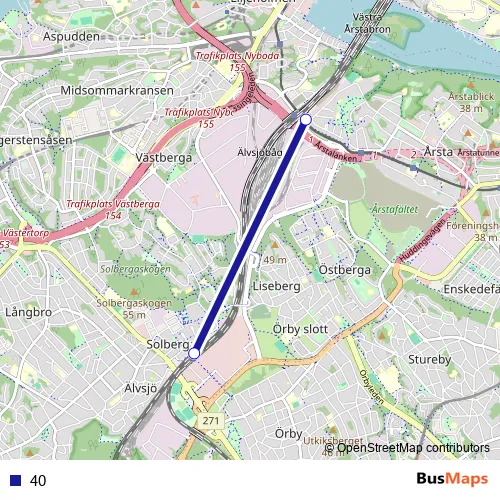 The first stop of the 40 bus route is Årstaberg station and the last stop is Älvsjö station. 40 is operational during på helger.
