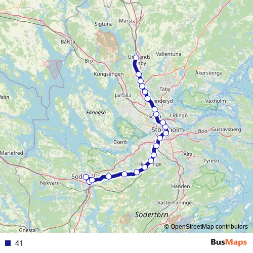 The first stop of the 41 rail route is Södertälje centrum and the last stop is Upplands Väsby. 41 is operational during varje dag.