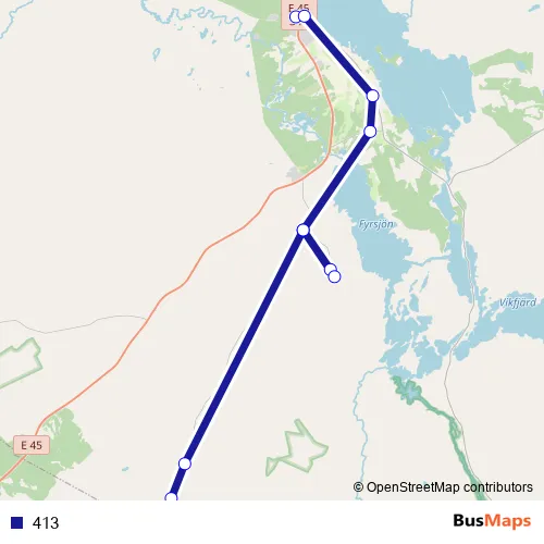 The first stop of the 413 bus route is Hammerdal busstation and the last stop is Kilen. 413 is operational during på vardagar.