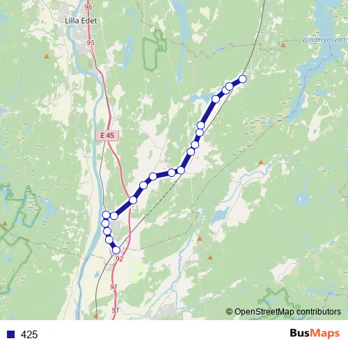 The first stop of the 425 bus route is Lödöse södra station and the last stop is Prässebo vändplats. 425 is operational during på vardagar.