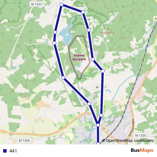 The first stop of the 441 bus route is Höör station and the last stop is Höör station. 441 is operational during varje dag.