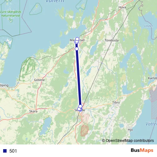 The first stop of the 501 bus route is Skövde Centralstation and the last stop is Mariestad station. 501 is operational during på vardagar.