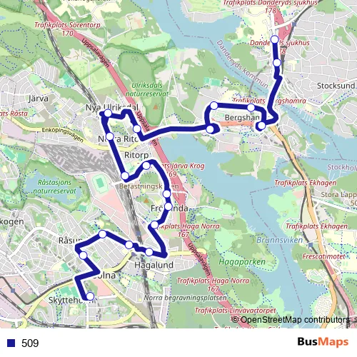 The first stop of the 509 bus route is Solna centrum and the last stop is Danderyds sjukhus. 509 is operational during varje dag.
