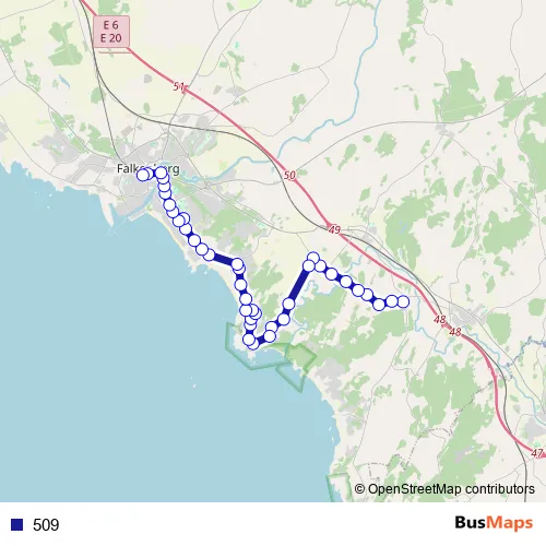 The first stop of the 509 bus route is Eftra korsväg and the last stop is Falkenberg bussterminal. 509 is operational during varje dag.