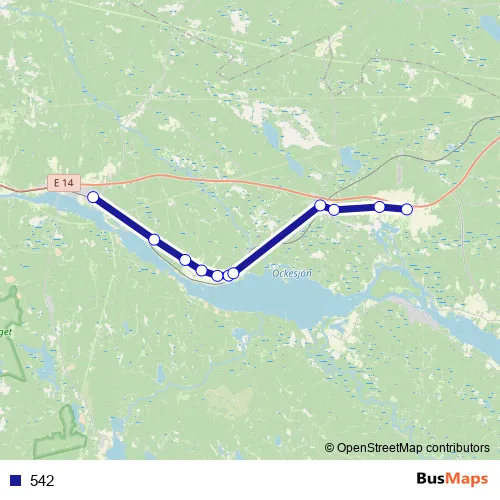 Services on the 542 bus stop at 14:05 on måndag, tisdag, onsdag, torsdag, fredag.