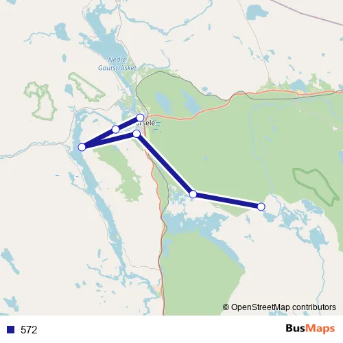The first stop of the 572 bus route is Aha and the last stop is Sorsele busstation. 572 is operational during på vardagar.
