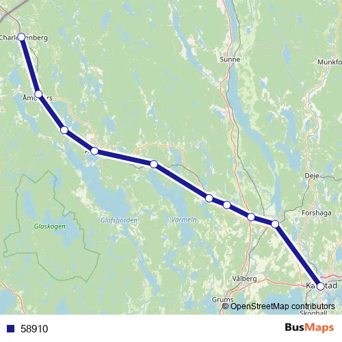 The first stop of the 58910 bus route is Kil station and the last stop is Karlstad Centralstation. 58910 is operational during varje dag.