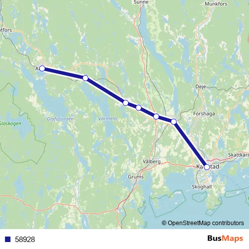 The first stop of the 58928 bus route is Arvika station and the last stop is Karlstad Centralstation. 58928 is operational during varje dag.