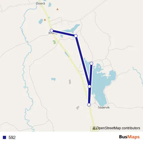 The first stop of the 592 bus route is Östervik and the last stop is Kroksjö. 592 is operational during på vardagar.