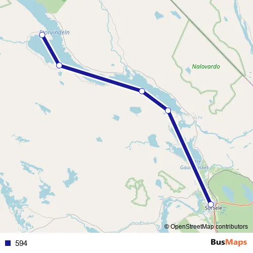 The first stop of the 594 bus route is Skansnäs and the last stop is Sorsele busstation. 594 is operational during på vardagar.