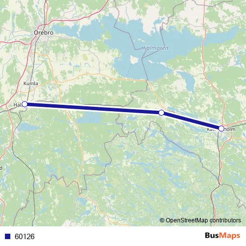 The first stop of the 60126 bus route is Hallsberg station and the last stop is Katrineholm Centralstation. 60126 is operational during på helger.