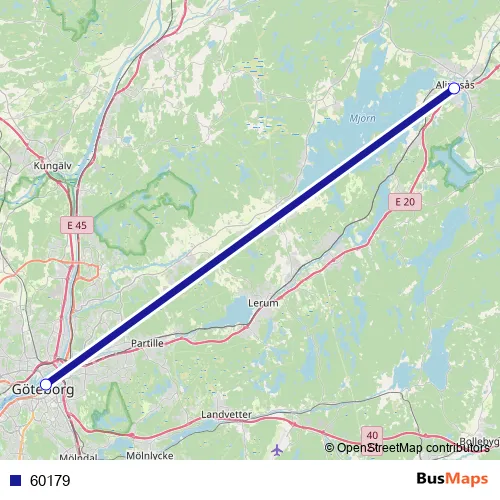 The first stop of the 60179 bus route is Alingsås station and the last stop is Göteborg Nils Ericsonterminal. 60179 is operational during på helger.
