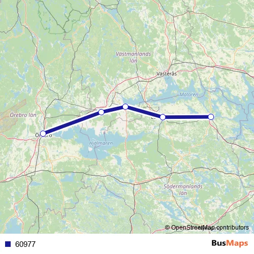 The first stop of the 60977 bus route is Eskilstuna Centralstation and the last stop is Örebro Centralstation. 60977 is operational during på vardagar.