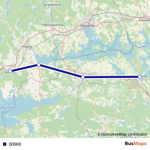 The first stop of the 60988 bus route is Arboga station and the last stop is