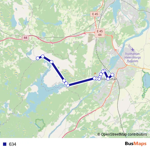 The first stop of the 634 bus route is Trollhättan Centralstation and the last stop is Sågbron. 634 is operational during varje dag.