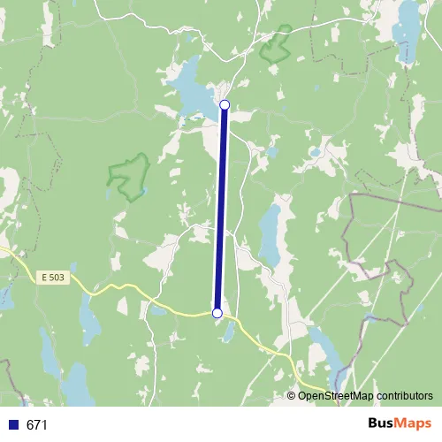 The first stop of the 671 bus route is Hålan Västra and the last stop is Trehörna kyrka. 671 is operational during på vardagar.