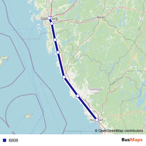 The first stop of the 6808 bus route is Göteborg Centralstation and the last stop is Halmstad C Resecentrum. 6808 is operational during varje dag.