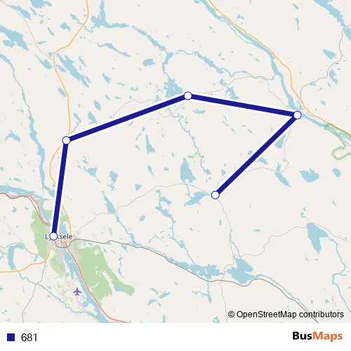 The first stop of the 681 bus route is Lycksele Resecentrum/Station and the last stop is Busjön. 681 is operational during på vardagar.