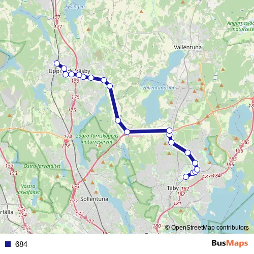 The first stop of the 684 bus route is Täby centrum station and the last stop is Upplands Väsby station. 684 is operational during varje dag.