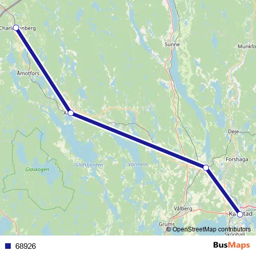 The first stop of the 68926 bus route is Charlottenberg station and the last stop is Karlstad Centralstation. 68926 is operational during varje dag.