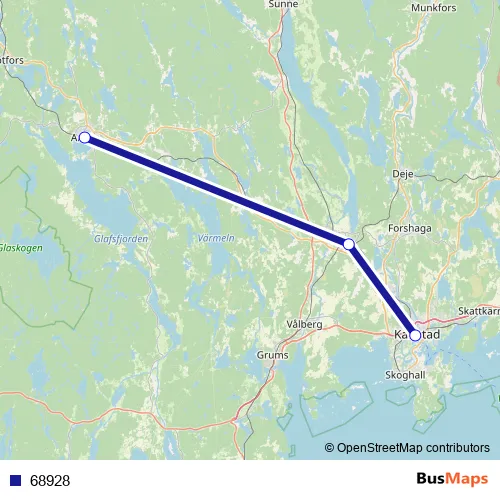 The first stop of the 68928 bus route is Arvika station and the last stop is Karlstad Centralstation. 68928 is operational during varje dag.