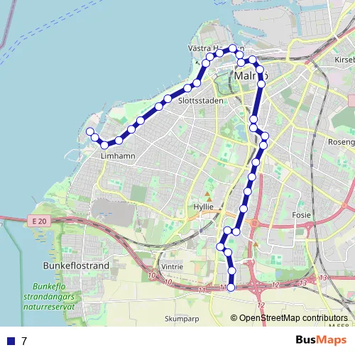 The first stop of the 7 bus route is Malmö Ön and the last stop is Malmö Svågertorp station. 7 is operational during varje dag.