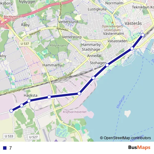 The first stop of the 7 bus route is Västerås Hacksta and the last stop is Västerås Centralstation. 7 is operational during varje dag.
