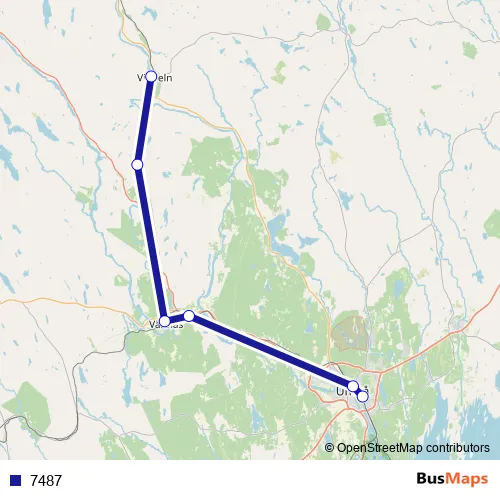 The first stop of the 7487 rail route is Vindeln Resecentrum/Station and the last stop is Umeå Östra station. 7487 is operational during på vardagar.