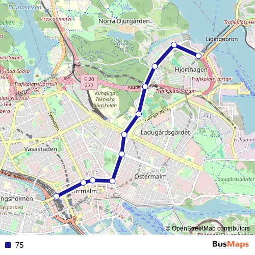 The first stop of the 75 bus route is Ropsten T-bana and the last stop is Stockholm Citytermin Kungsbron. 75 is operational during på vardagar.
