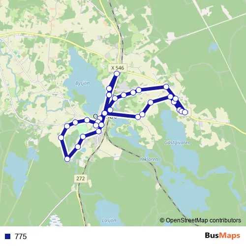 The first stop of the 775 bus route is Ockelbo station and the last stop is Ockelbo Torget. 775 is operational during på vardagar.