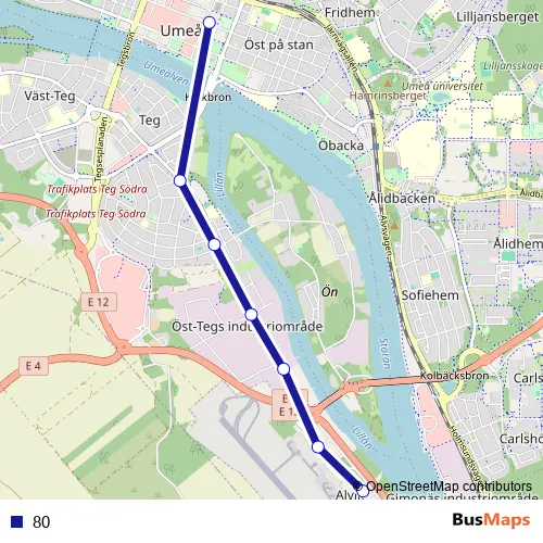 The first stop of the 80 bus route is Umeå Vasaplan and the last stop is Umeå Airport. 80 is operational during varje dag.