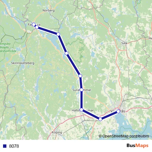 The first stop of the 8078 rail route is Västerås Centralstation and the last stop is Fagersta Norra station. 8078 is operational during på helger.