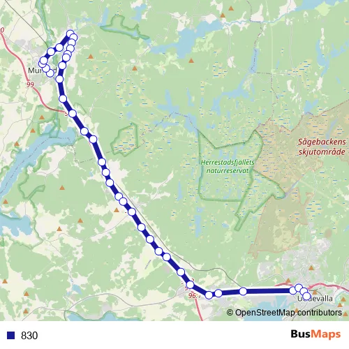 The first stop of the 830 bus route is Munkedal station and the last stop is Uddevalla Kampenhof. 830 is operational during varje dag.