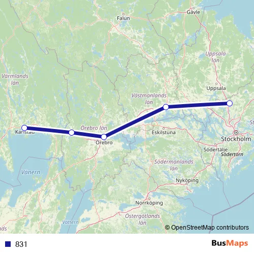 The first stop of the 831 bus route is Karlstad busstation and the last stop is Arlanda terminal 4 buss. 831 is operational during varje dag.
