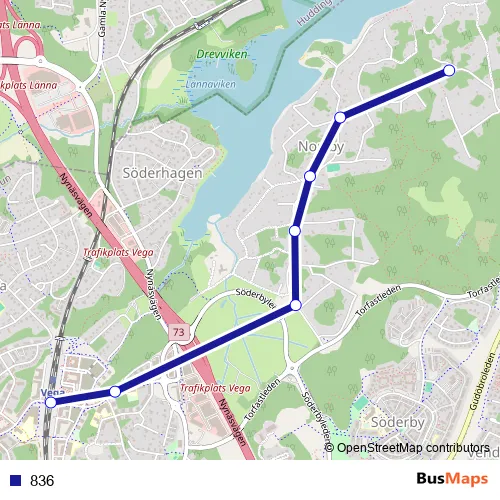 The first stop of the 836 bus route is Vega station and the last stop is Flodvägen. 836 is operational during varje dag.
