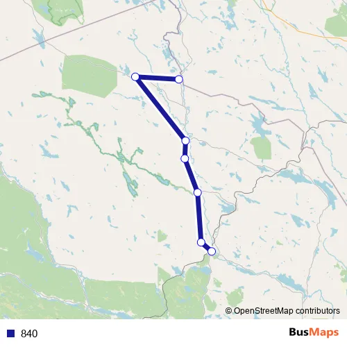 The first stop of the 840 bus route is Björna centrum and the last stop is Aspsele. 840 is operational during på vardagar.