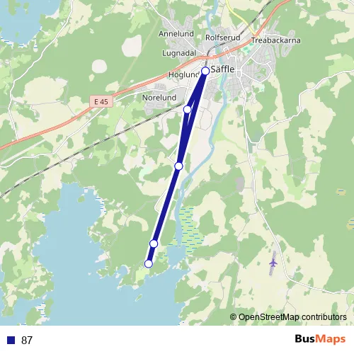 The first stop of the 87 bus route is Säffle station and the last stop is Säffle station. 87 is operational during på vardagar.