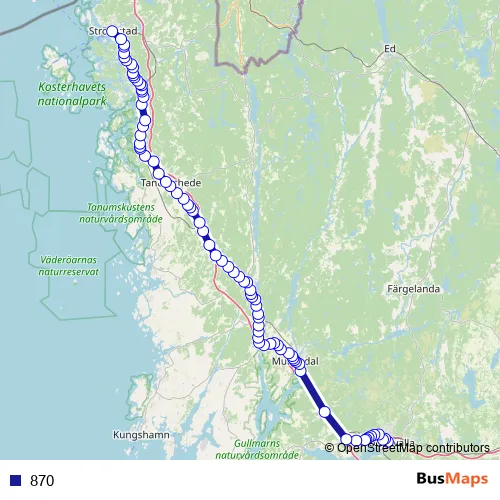 The first stop of the 870 bus route is Uddevalla Kampenhof and the last stop is Strömstad station. 870 is operational during varje dag.
