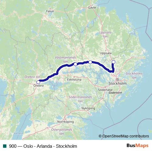 The first stop of the 900 bus route is Örebro Resecentrum and the last stop is Stockholm-Arlanda flygplats. 900 (Oslo - Arlanda - Stockholm) is operational during varje dag.