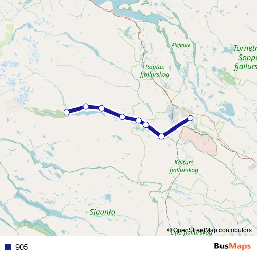 The first stop of the 905 bus route is Kiruna flygplats and the last stop is Nikkaluokta fjällanläggning. 905 is operational during varje dag.