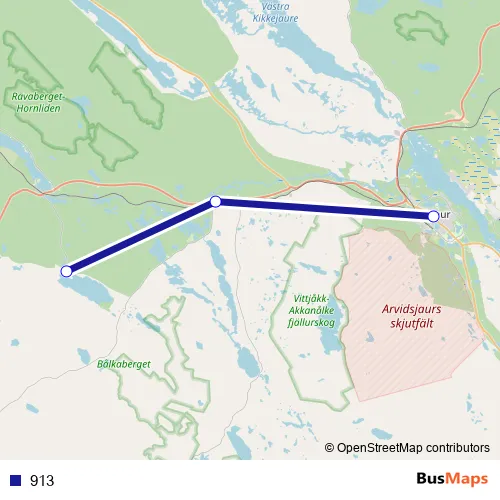 The first stop of the 913 bus route is Arvidsjaur busstation and the last stop is Månsträsk. 913 is operational during varje dag.