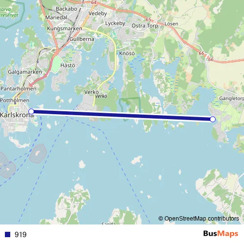 The first stop of the 919 bus route is Karlskrona Handelshamnen and the last stop is Trummenäs brygga. 919 is operational during på vardagar.