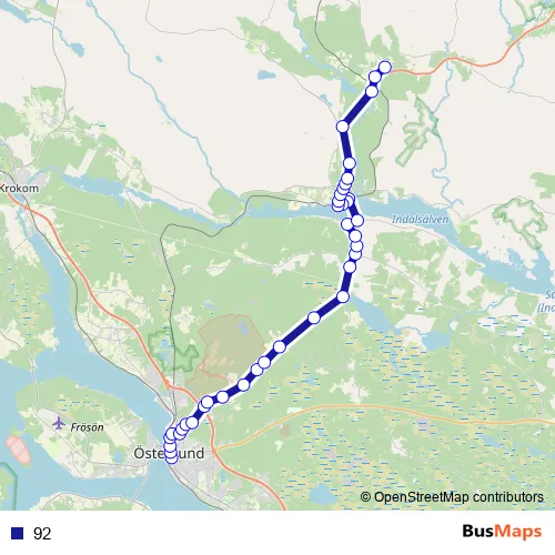 The first stop of the 92 bus route is Östersund busstation and the last stop is Häggenås skola. 92 is operational during på helger.