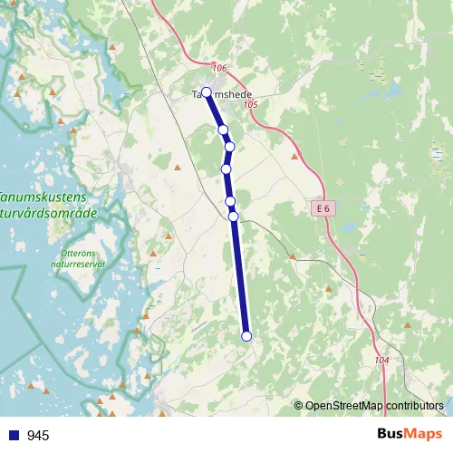 The first stop of the 945 bus route is Tanumshede centrum and the last stop is Åbrott. 945 is operational during på vardagar.