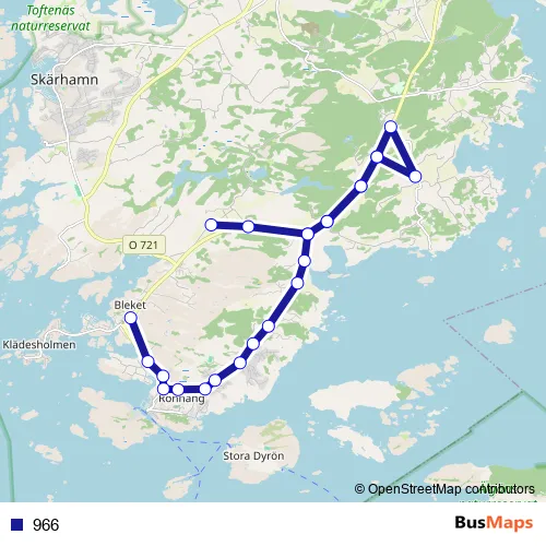 The first stop of the 966 bus route is Tollebyvägen and the last stop is Bleket Bleketskolan. 966 is operational during på vardagar.