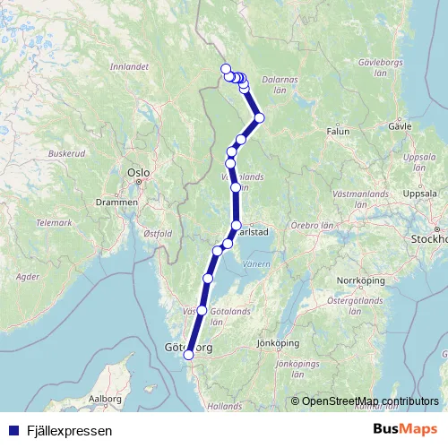 The first stop of the Fjällexpressen bus route is Göteborg Nils Ericsonterminal and the last stop is